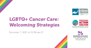 On December 7, 2021 we partnered with Pennsylvania Action Coalition, the National Nurse-Led Care Consortium, and the Bradbury-Sullivan LGBT Community Center to present a webinar on LGBTQ+ cancer health disparities and cancer screening guidelines for LGBTQ+ communities. In addition, we shared findings from Out: The National Cancer Survey including data and stories from LGBTQ+ cancer survivors. You can watch the webinar by visiting the link below: